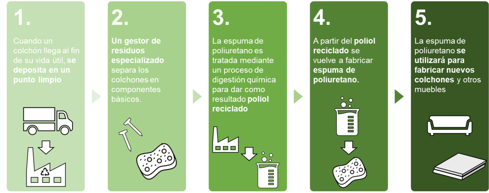 Este poliol reciclado es sintetizado a partir de colchones tras el final de su vida útil, que en lugar de ser incinerados o quemados, son sometidos a un proceso de digestión química que da como resultado un poliol reciclado funcional para la fabricación de espumas flexibles de poliuretano.